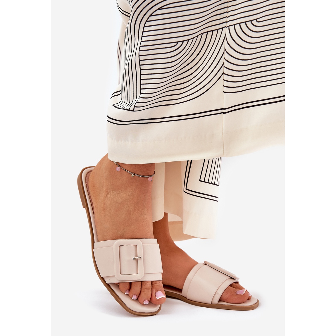 A jellegzetes részletek egy nagy csat formájában az övben finom varázst adnak, így ezek a flip -flopok divatos akcentussá válnak minden stílushoz. Tökéletesek mind a mindennapi alkalmi készletekhez, mind az elegánsabb ruhákhoz, mert egyszerűségük hangsúlyozza minden nő természetes szépségét.