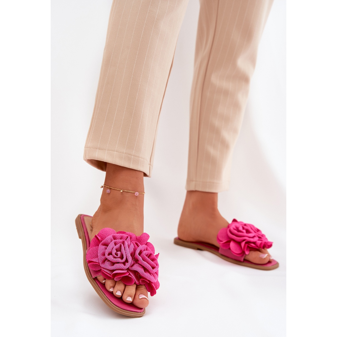 Részletek: Lapos, rágcsált női papucs dekoratív fukszia virágokkal rózsaszín