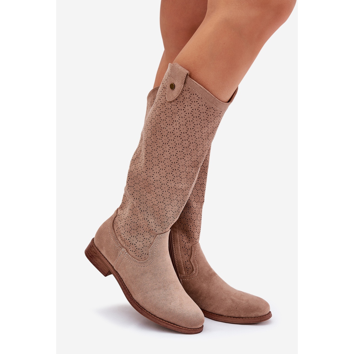 A lapos sarkú csizma nyitott mintázatú S. Barski Hy51-062 bézs árnyékban elegáns javaslat azoknak a nőknek, akik értékelik a kényelmet és a stílust a mindennapi stilizációkban. Kiváló minőségű öko velúrból készültek, ezek a csizmák egész nap kényelmet nyújtanak, köszönhetően egy 3 cm magasságú lapos saroknak.