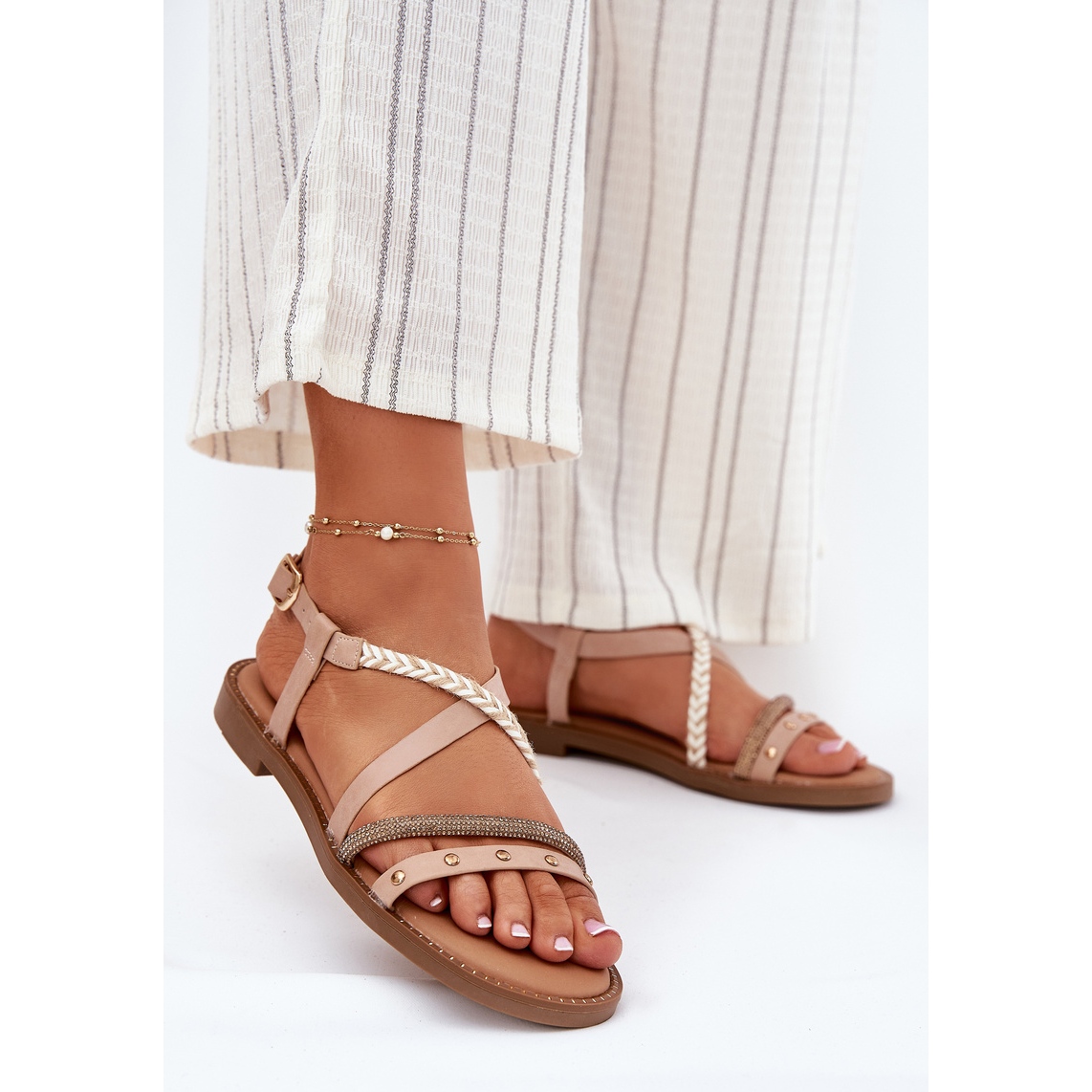 Részletek: Vinceza Lapos szandál dekoratív vineza 17379 bézs csíkokkal