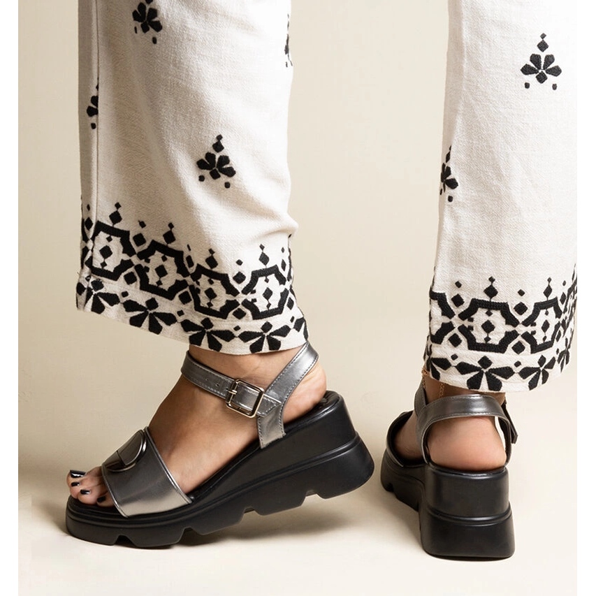 Egy magas, 7 cm magasságú ék nem csak néhány centiméter magasra ad hozzá, hanem elegánsnak is tűnik. Az ezüstös színű "pisztoly" fekete műanyag talpmal kombinálva ezeket a szandált rendkívül sokoldalúvá teszi - ideális sok nyári stilizációhoz, mind napi, mind különleges alkalmakkor.