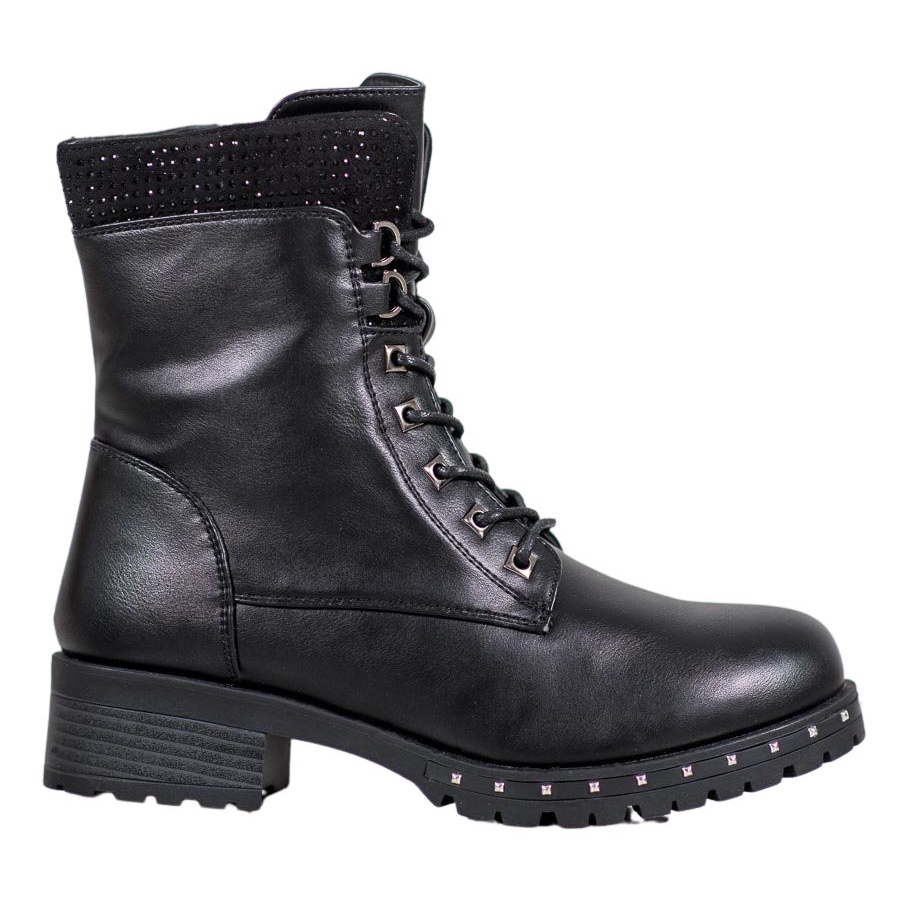 A 16 cm magas felsőrész hatékonyan véd a kedvezőtlen időjárási viszonyoktól, a kerek orr pedig finomságot ad. A 2 cm vastag, magas és lapos szintetikus talp stabilitást és kényelmet biztosít minden lépésnél. Ezenkívül a strasszok és a szegecsek a tetején stílusos akcentussal ruházzák fel a cipőt.
