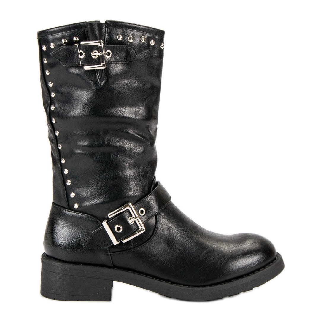 Kiváló minőségű ökológiai bőrből készült, masszív felépítés és elegáns, rock stílus jellemzi őket. A dekoratív csat és a fém strassz karaktert kölcsönöz nekik, így tökéletesen kiegészítik az alkalmi és kifejezőbb stílusokat. A beépített, merevített saroknak köszönhetően a csizma nem csak jól tartja a lábat, de járás közben is stabilitást biztosít.