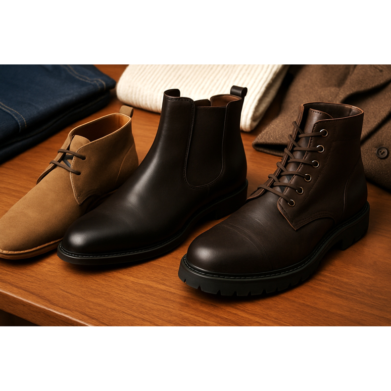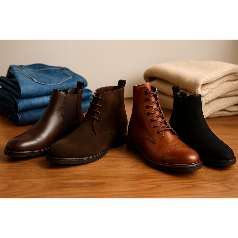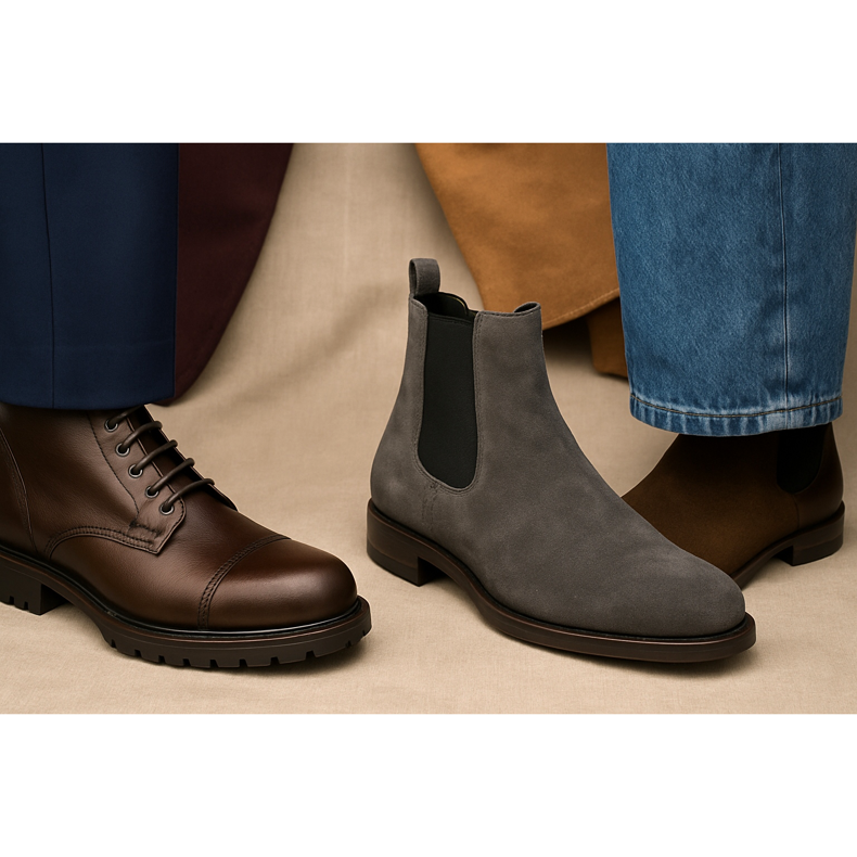 - Növekedés — alacsonyabb férfiak: válassz karcsú modelleket (Chelsea, keskeny chukka) a masszív táskacsizmák helyett.