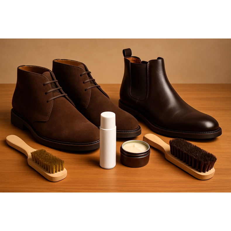 Cipőszínű krém vagy paszta, lószőrkefe, cédrus cipőfák minden viselet után.