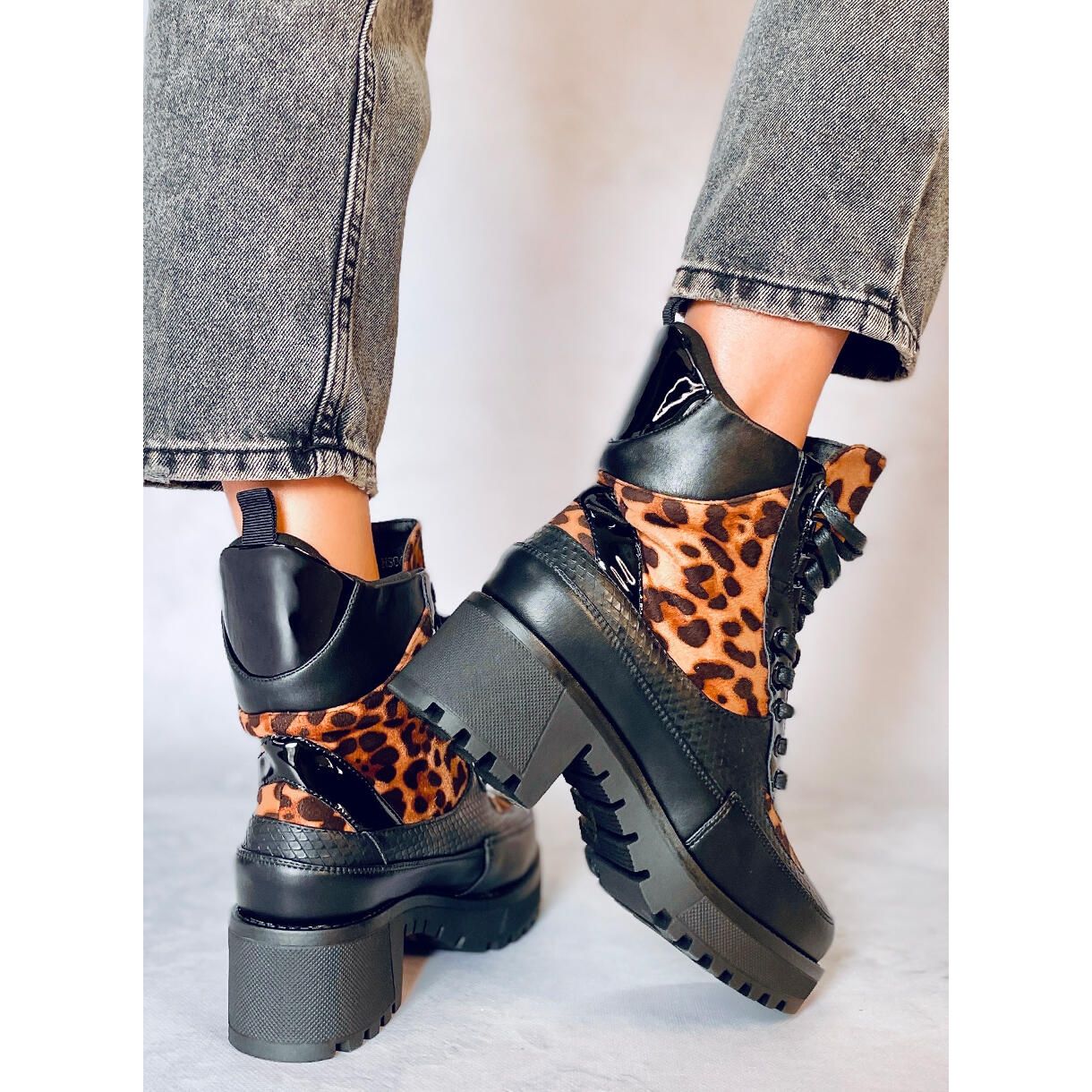 Fedezze fel az egyedi stílust és kényelmet a divatos leopárd motívumú NS067 magas talpú női csizmának köszönhetően. Ez a fekete, fűzős bokacsizma tökéletes választás azoknak a nőknek, akik szeretnének kitűnni a tömegből és követni a legújabb divattrendeket.