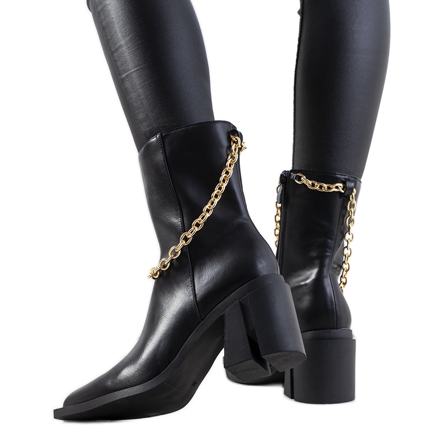 A jellegzetes hegyes orr és a finom lánccal ellátott felsőrész optikailag karcsúsítja a lábakat, így minden nő vonzónak és magabiztosnak érzi magát bennük. A gumitalpnak köszönhetően a lábbeli nem csak stílusos, hanem funkcionális is, biztosítva a tapadást és a kényelmet viselése közben. A cipő magassága a boka fölé ér, a 7,5 cm-es sarok pedig stílust és bájt ad.
