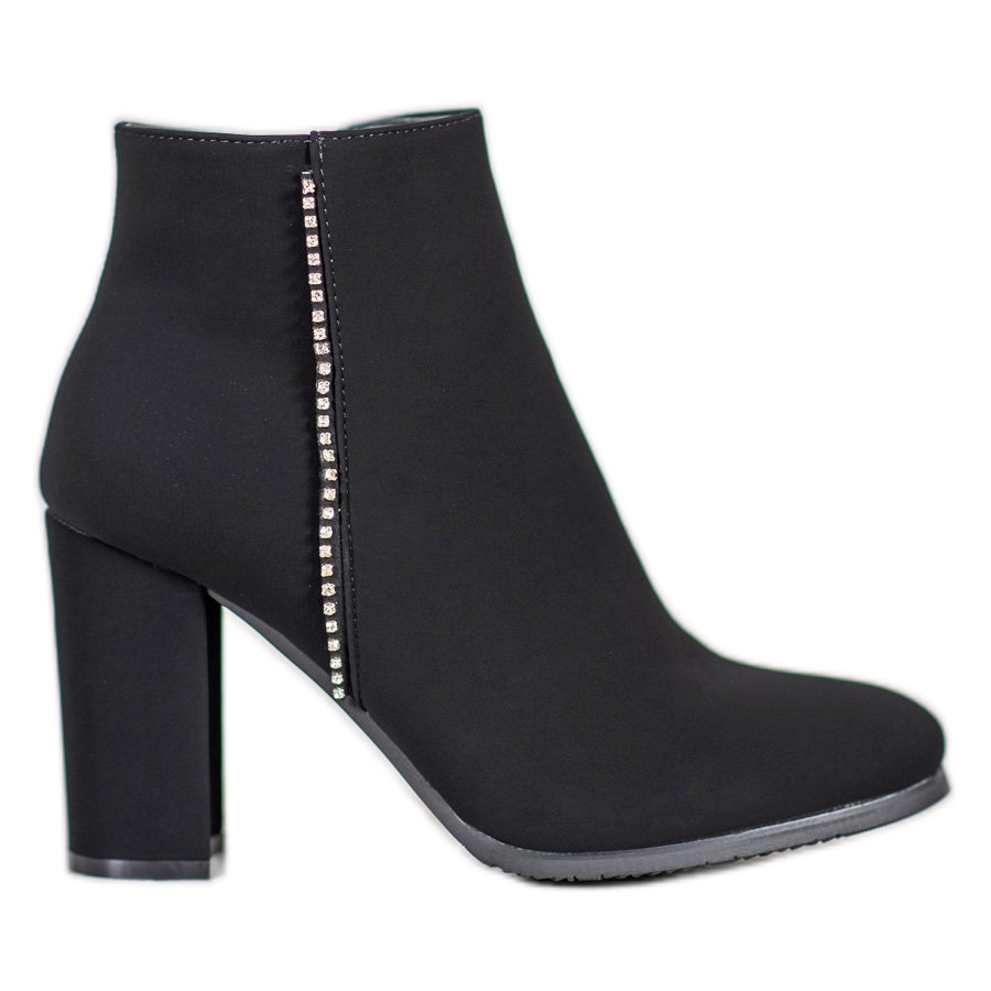 Ezeknek a cipőknek a fő vonzereje a magas, masszív, 9 cm magas blokksarok, amely nem csak néhány centimétert ad viselőjének, de stabilitást is biztosít járás közben. A magas bokafelső hatékonyan véd a hideg ellen, ugyanakkor van egy esztétikus oldala is - jobb oldalon apró, csillogó cirkóniák sora díszíti, amitől a cipő kimagaslóan vonzó megjelenésű.