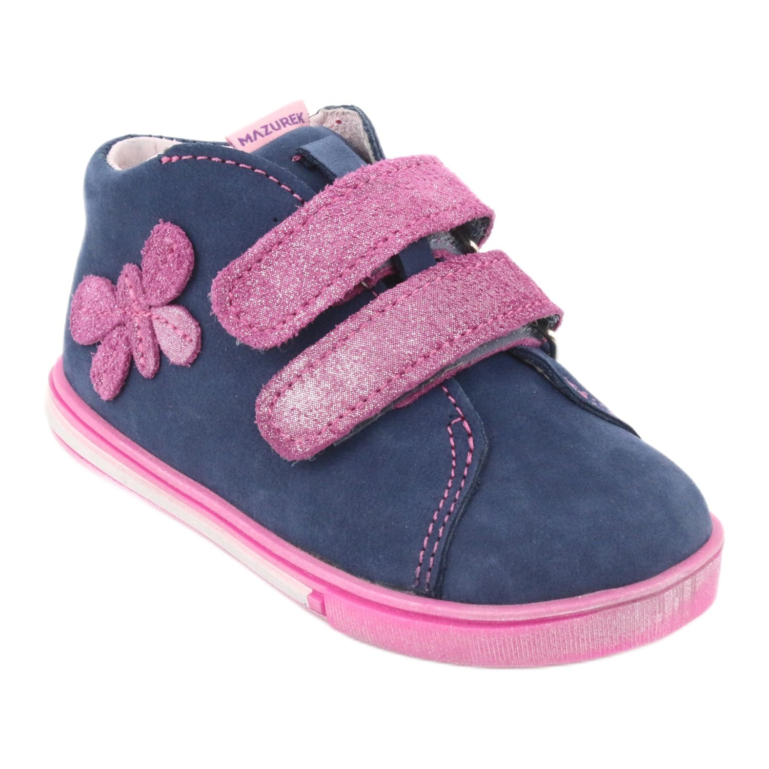 Stílusos és kényelmes gyermekcipők Mazurek 264, teljes egészében természetes bőrből. A sötétkék felső, bájos rózsaszín pillangóval a cipő karakterét adja a cipőnek, és a gondos kivitel megerősíti a lengyel gyártó minőségét.