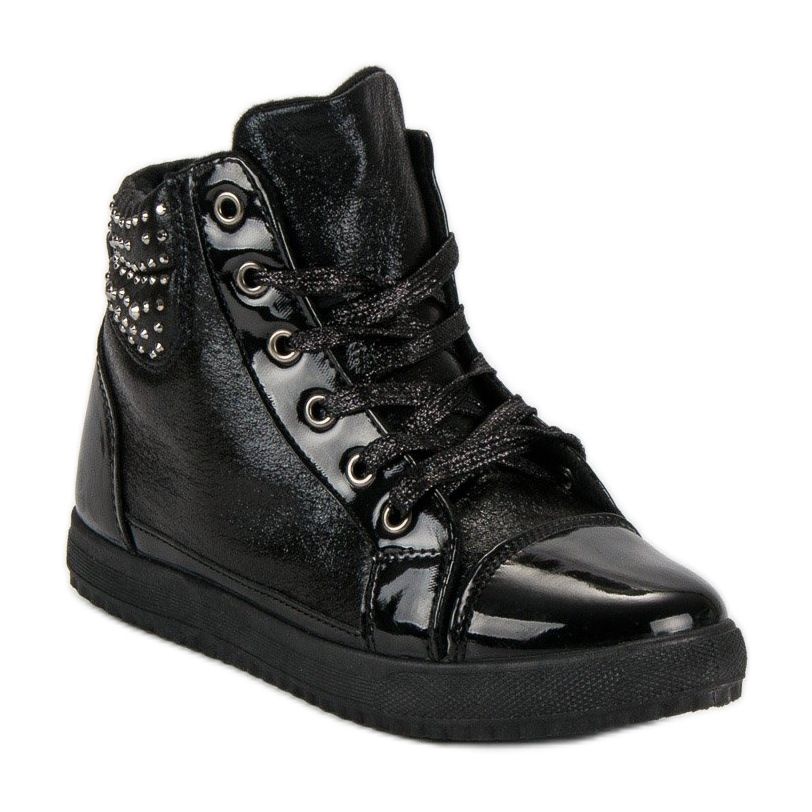 Fedezze fel a kényelem és a stílus új dimenzióját fekete fűzős tornacipőinkkel, amelyek minden női gardrób elengedhetetlen kellékei. A kiváló minőségű ökológiai bőrből és textilanyagból készült cipők a sportos lezserséget ötvözik a rock varázsával. Egyedülálló, fényes kristályokkal és szemet gyönyörködtető szegecsekkel gazdagított dizájnjuk ideális választássá teszi mind a mindennapi használatra, mind az esti kirándulásokhoz.