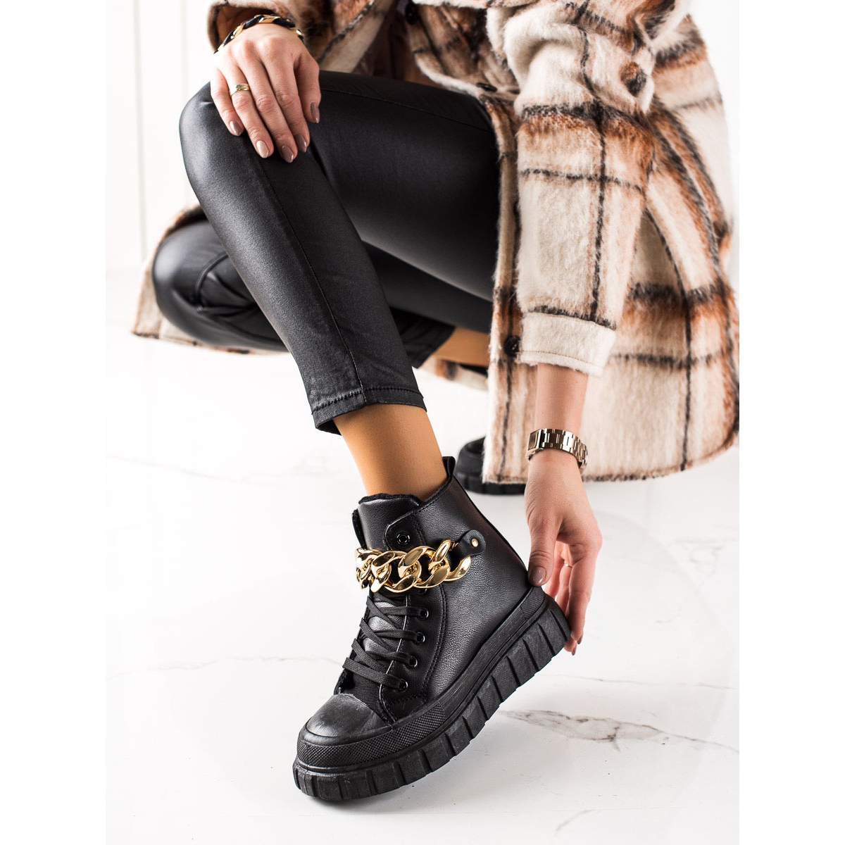 Fedezze fel az egyedülálló eleganciát és kényelmet a fekete TRENDI tornacipőkkel. Ezek a divatos női cipők az alkalmi stílust ötvözik a legújabb trendekkel, tökéletesek az őszi/téli szezonra. Kiváló minőségű ökológiai bőrből készültek, nem csak esztétikus megjelenést, hanem viselési kényelmet is biztosítanak.