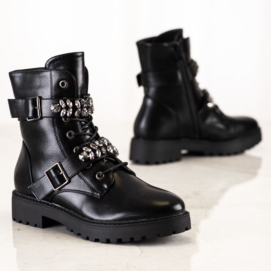 A kiváló minőségű műbőrből készült cipőket esztétikus részletek, például dekoratív csatok és kristályok jellemzik, amelyek egyedi varázst adnak nekik. A merevített, zárt sarok és a szigetelés melegen tartja a lábát a hidegebb napokon is.