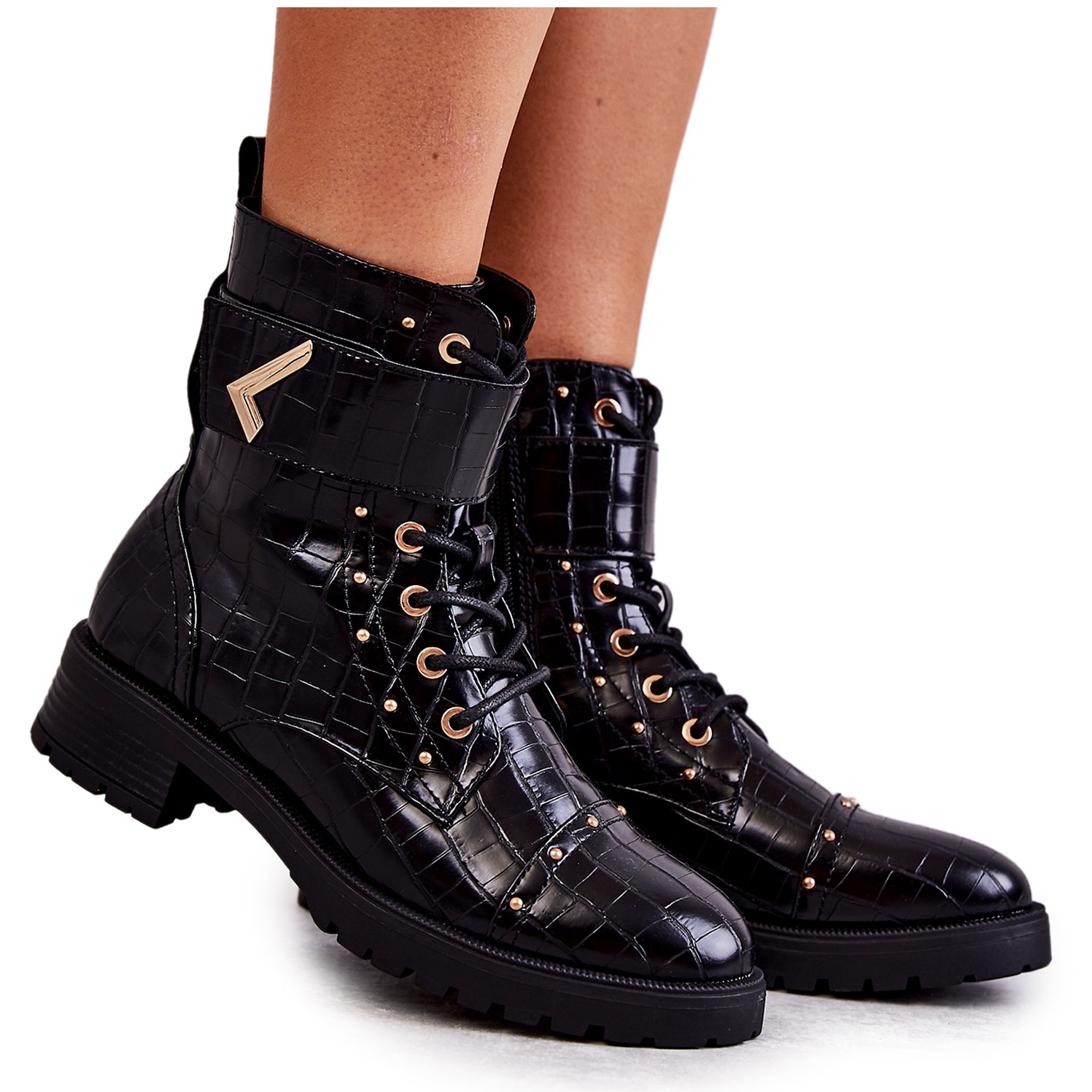 A cipők klasszikus dizájnja fűzéssel és praktikus rögzítéssel a felsőrész oldalán eleganciát ad és megkönnyíti a felhúzást. A dekoratív tépőzáras pánt és a strassz részletek kiemelik a többi modell közül, divatos karaktert adva nekik. Az alacsony és stabil 4 cm-es sarok rendkívül kényelmessé teszi a csizmát - tökéletes mind a mindennapi formázáshoz, mind a hivatalosabb alkalmakhoz.