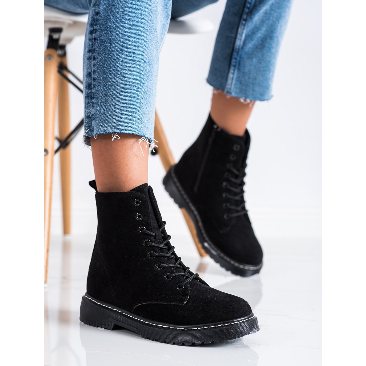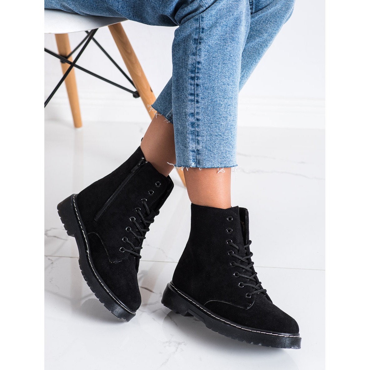 A SHELOVET a kényelemre összpontosított, puha, zárt sarokkal és lapos, 3 cm magas sarokkal. A futófelülettel ellátott műanyag talp megfelelő tapadást és stabilitást biztosít különféle felületeken. A cipzár és a fűző lehetővé teszi a tökéletes illeszkedést a lábhoz.