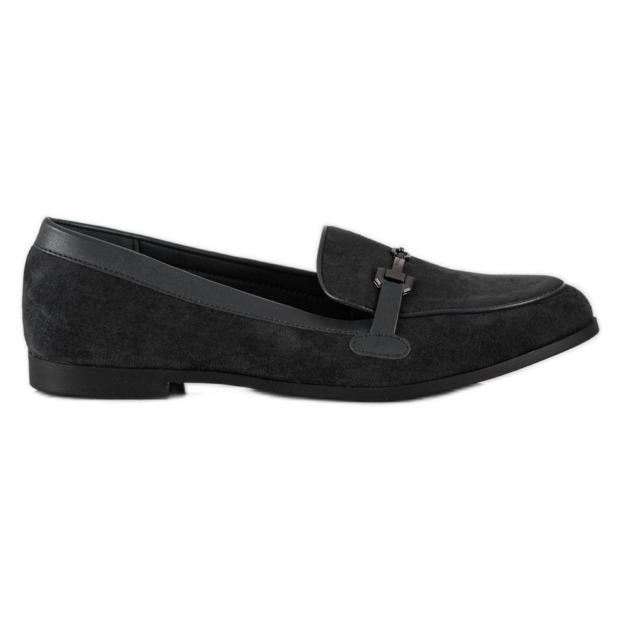 A kiváló minőségű anyagokból készült mokaszinok puha, beépített sarokkal és sima műanyag talppal rendelkeznek, amely viselés közben biztosítja a kényelmet. A cipő felső része velúrutánzatból készült, amely eleganciát és stílust kölcsönöz, a kerek orr pedig növeli a használati kényelmet.
