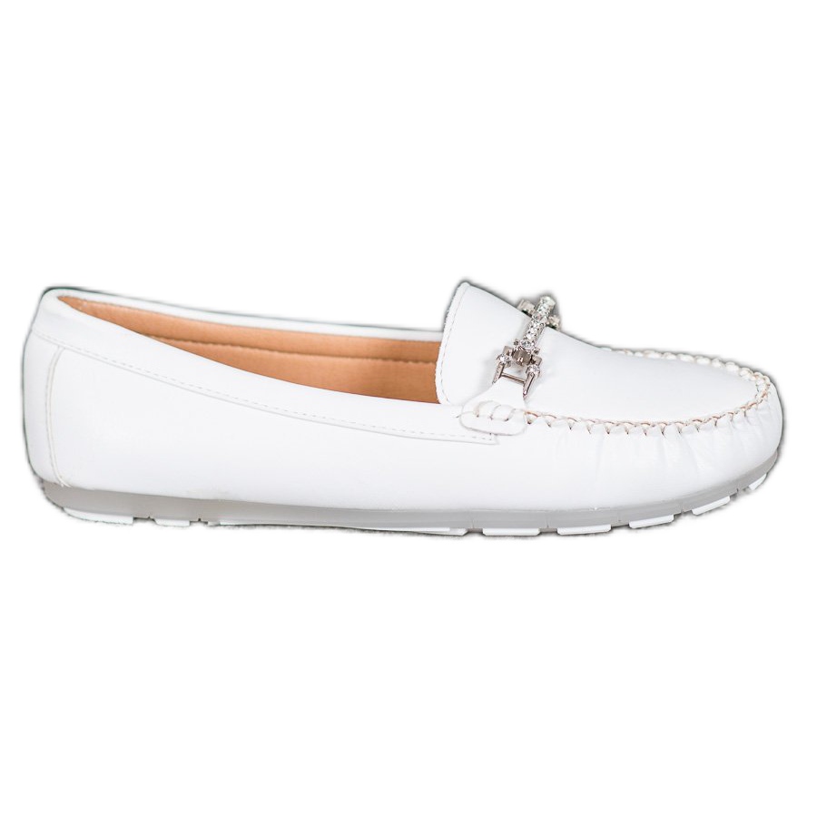 A mokaszinok kiváló minőségű bőrszerű anyagból készülnek, amely nemcsak a vonzó megjelenést, hanem a viselési kényelmet is biztosítja. A felsőrész teljes felülete elegáns fehér színben kiemelkedik a többi modell közül. A lekerekített lábujjak és a fodros csatlakozások finom varázst adnak, a cirkóniákkal díszített ezüst csat pedig egyedi fényt ad az egésznek.