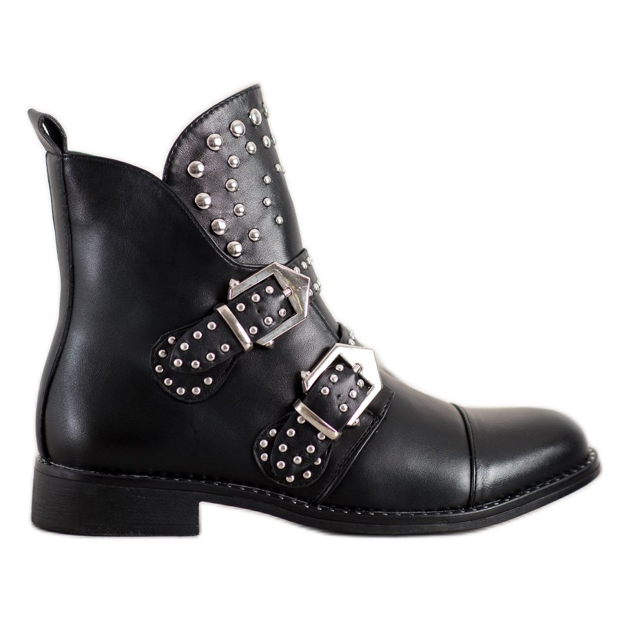 Kiváló minőségű ökológiai bőrből készültek, dekoratív csatok és ezüst strasszok jellemzik őket, amelyek egyedi karaktert adnak nekik. A 13-14 cm-es felső magasság és a puha, beépített sarok tökéletes illeszkedést és viselési kényelmet biztosít.
