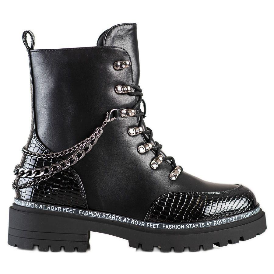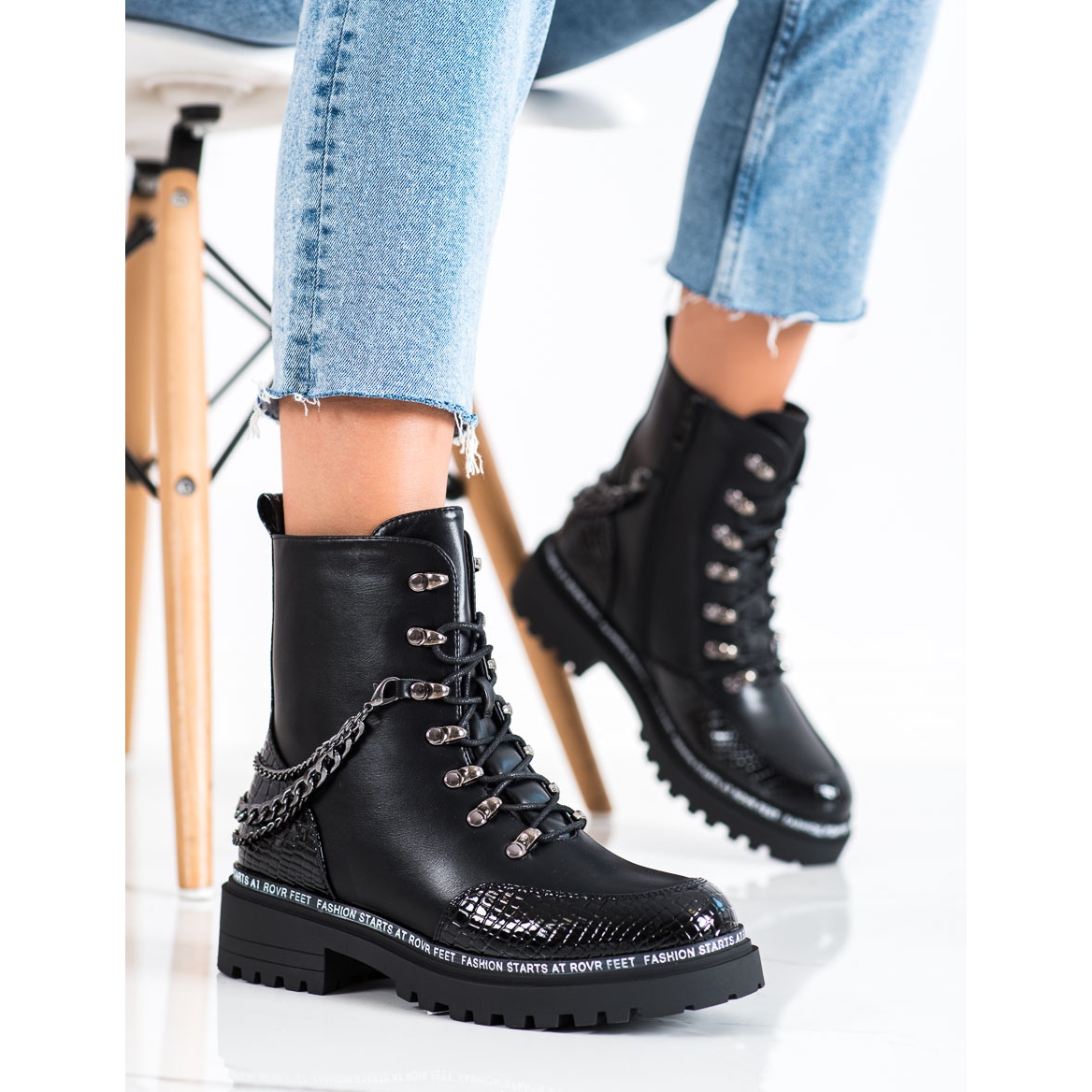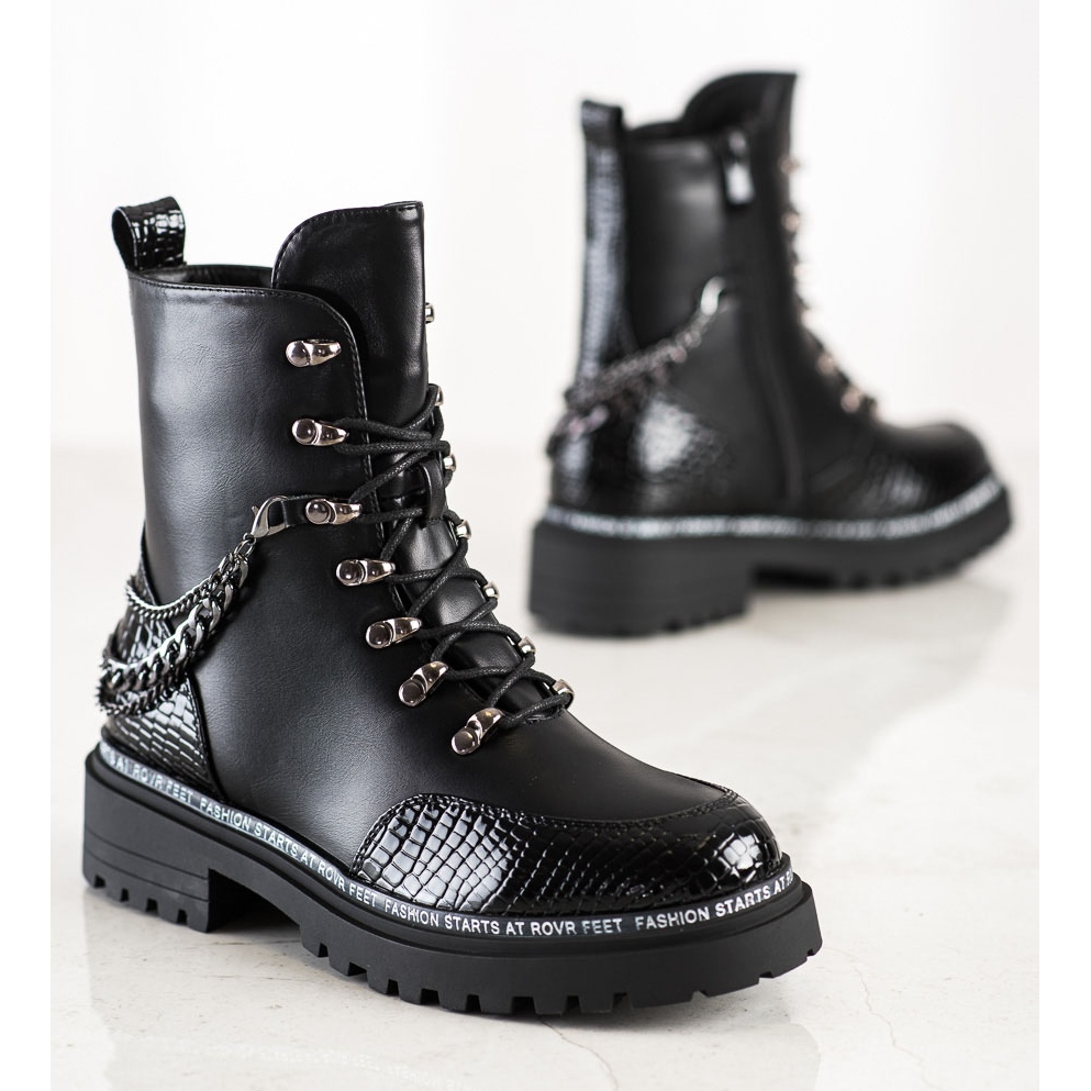 Kiváló minőségű ökológiai bőrből készültek, masszív és stílusos megjelenés jellemzi őket. A dekoratív lánc egyedi akcentust kölcsönöz nekik, amely vonzza a tekintetet. A dolgozók cipzárral és fűzővel rendelkeznek, ami tökéletes illeszkedést biztosít a lábhoz. A beépített, merevített sarok emellett növeli a viselési kényelmet, a szigetelés pedig hideg napokon is melegen tartja a lábát.