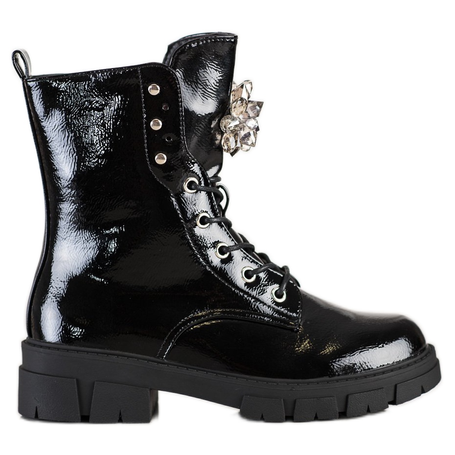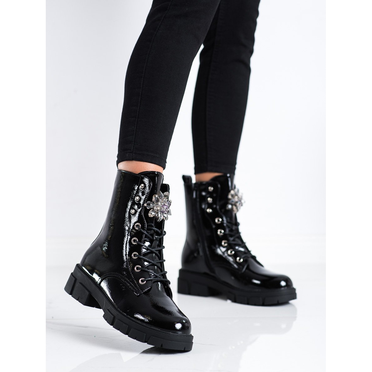 A modell tökéletesen illeszkedik a lezser, elegáns stílushoz, mindennapi használatra tökéletes. S.BARSKI a részletekről is gondoskodott, strasszokat és lakkozott felületet adott hozzá, ami felkelti a figyelmet. További előnyt jelent a cipzáras záródás és a fűzős fűzők, amelyek megkönnyítik a felhelyezést és a lábhoz való igazodást.