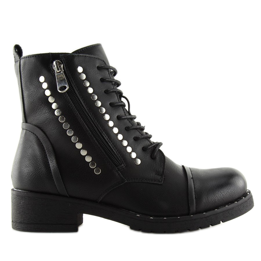 A 88060 Black Studded Workers tökéletes választás azoknak a nőknek, akik stílusos és kényelmes mindennapi cipőt keresnek. Ezeket a klasszikus fekete színű, lapos talpú, fűzős csizmákat nem csak eleganciájuk, hanem divatos, szegecsek és ezüst strasszok formájú részletek is megkülönböztetik, amelyek egyedi karaktert kölcsönöznek nekik.