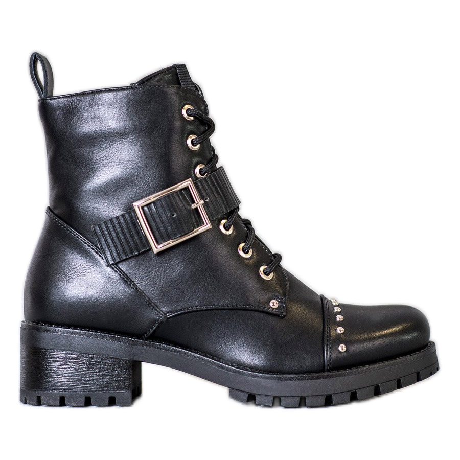 Ezeket a cipőket elöl érdekes fűzés, oldalán praktikus cipzár jellemzi, ami megkönnyíti a cipő fel- és levételét. Ezenkívül a csattal és strasszokkal ellátott dekoratív öv sziklás akcentust kölcsönöz a stílusnak, amely tökéletes azoknak a nőknek, akik szeretnek kitűnni a tömegből.
