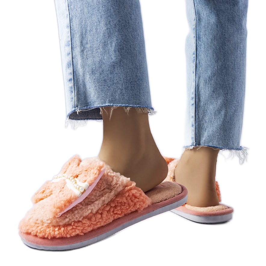 A narancssárga, beillesztett női papucs dekoratív íjjával a divatos formatervezés és a maximális kényelem kombinációja. A szigetelt belső tér és egy ragasztó, fehér gumi talp tökéletessé teszi őket meleg otthoni papucsként hűvösebb napokon.