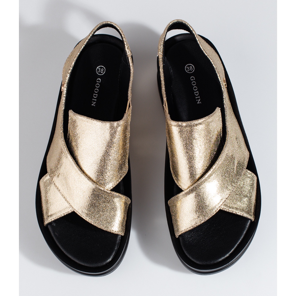 A nyitott sarok kiváló szellőzést biztosít, így tökéletes a tavaszi és nyári meleg napokra. A kiváló minőségű műbőrből készült szandál külseje és belseje egyaránt stílusos megjelenést és viselési kényelmet biztosít. Ezenkívül klasszikus szabásuk és arany színük tökéletes kiegészítője számos stílusnak – az elegáns ruháktól a hétköznapi nadrágokig.