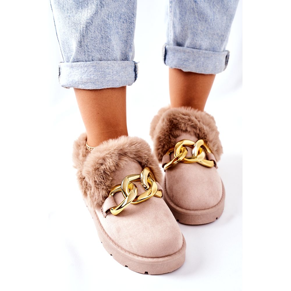 A papucsok gondosan, kellemes tapintású szintetikus szőrméből készültek, amely nemcsak optimális kényelmet, hanem meleget is biztosít a hideg napokon. További előny a szemet gyönyörködtető aranylánc, amely elegáns és modern karaktert kölcsönöz nekik. Ennek köszönhetően a kiegészítő a mindennapi és a kifinomultabb stílusok tökéletes kiegészítőjévé válik.