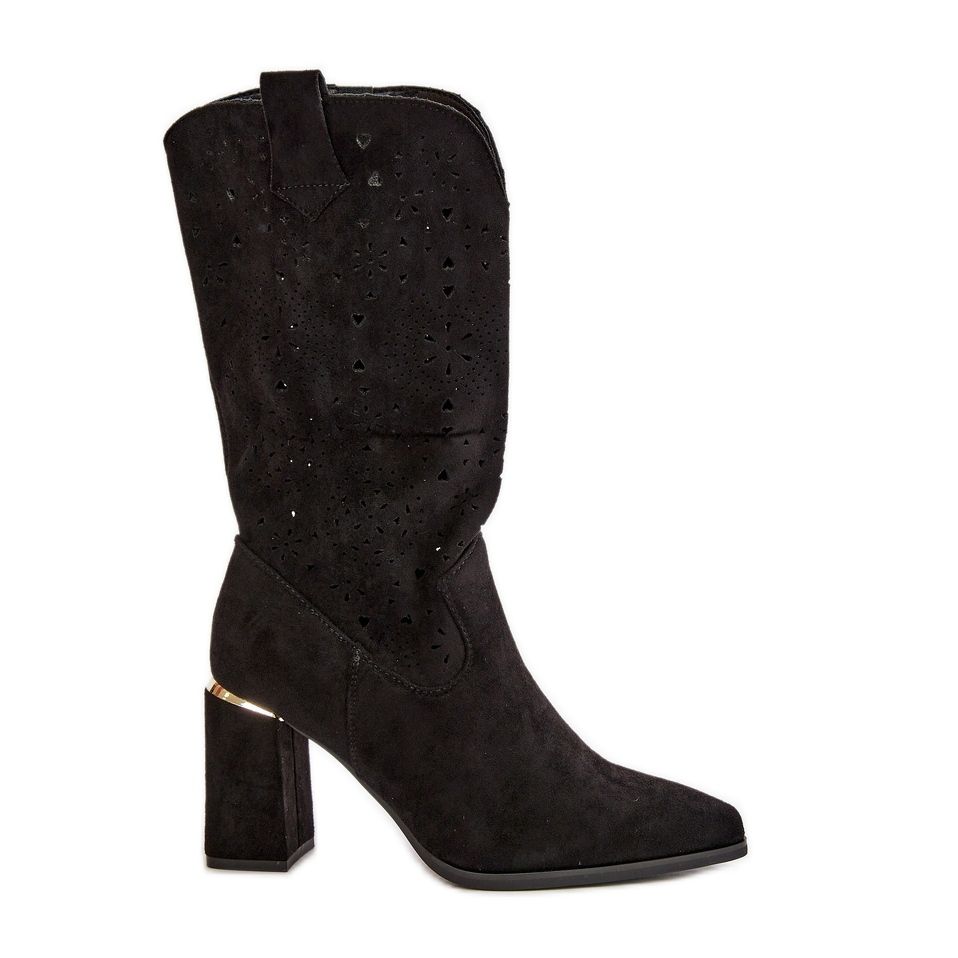 Részletek: Női áttört csizma magas sarkon hegyes orrral, Eco Suede fekete Nevithra