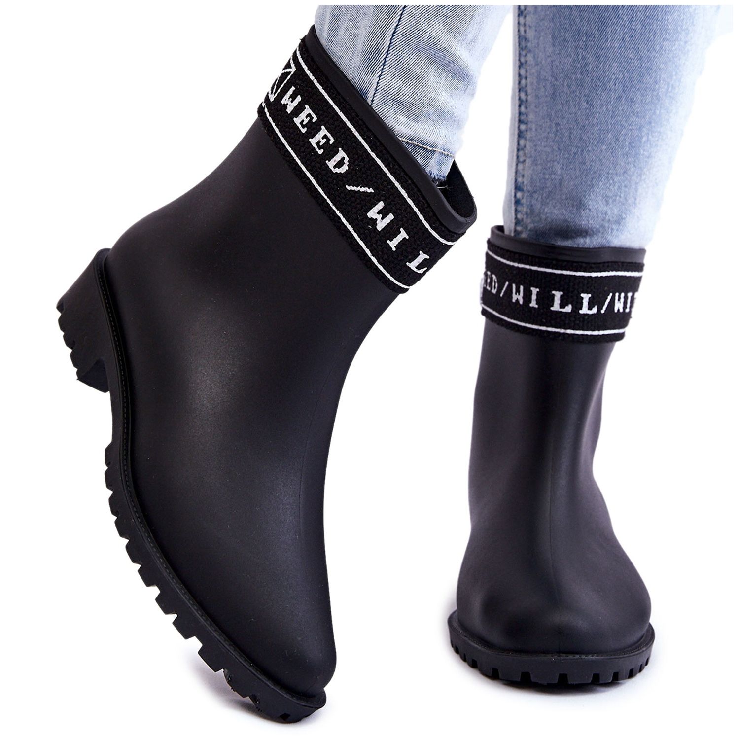 Ezek a bebújós Wellington csizmák, amelyeket jellegzetes csíkkal díszítenek, a felső részén felirattal, a divat kánonjaiba illeszkedik, miközben megőrzi a rossz időjárásra szánt lábbelik funkcionalitását. A fekete kialakítás lehetővé teszi a különböző stílusokhoz való rugalmas illeszkedést – az alkalmitól a formálisabbig.