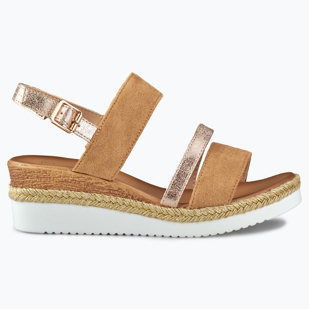 A környezetbarát velúrból készült szandál nem csak stílusos megjelenést biztosít, hanem környezetbarát választás is. A nyitott lábujjak könnyedséget kölcsönöznek, a fémes arany díszítés pedig szemet gyönyörködtetővé varázsolja ezeket a szandálokat, és fényessé varázsol minden stílust.