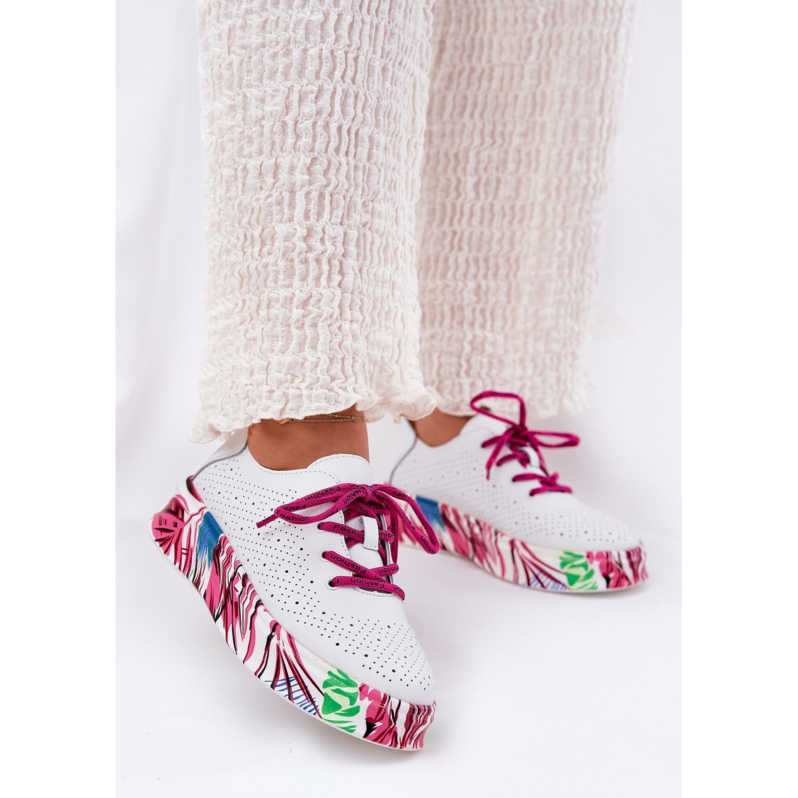 A modell nyitott részletekkel rendelkezik, amelyek frissességet adnak neki, és nagyszerű akcentussal rendelkeznek a nyári napokra. A cipők könnyűek, ami minden alkalommal gyakorlati választássá teszi őket. A csipke -rögzítő rögzítőelem lehetővé teszi a lábhoz tökéletesen illeszkedést, ami tovább növeli a használat kényelmét.