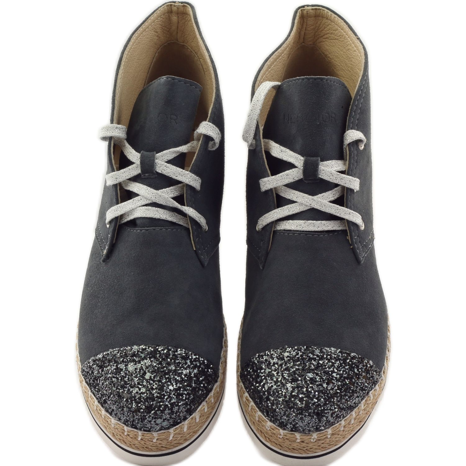 Fedezze fel az eleganciát és a kényelmet a női szürke/ezüst Neścior 098-B bőr espadrillákkal. Ezek az elegáns cipők, amelyek teljes egészében kiváló minőségű természetes velúr bőrből készültek, tökéletes kiegészítői lesznek minden nő ruhatárának.