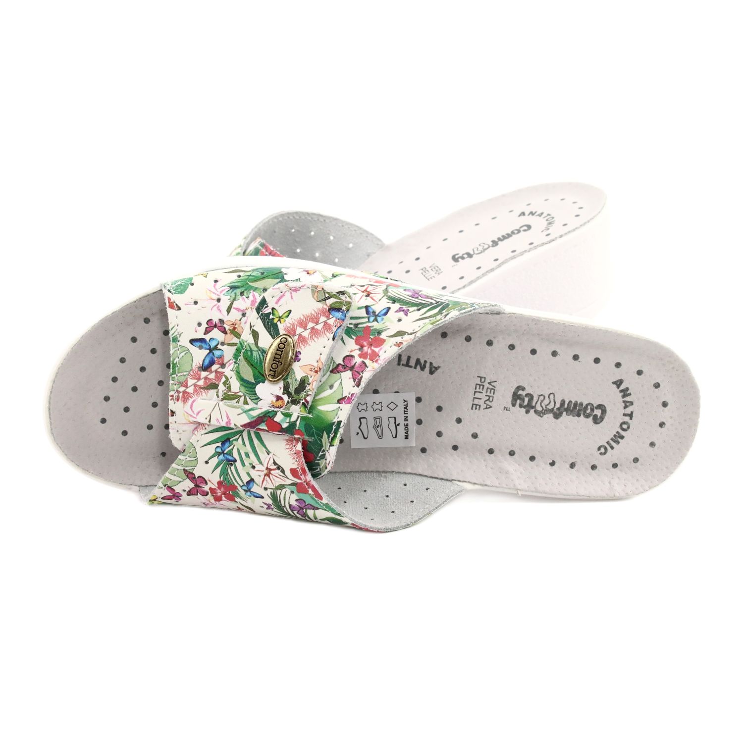 Az elegáns és ugyanakkor kényelmes Lucia a Comfoty -ból javaslatot jelent azoknak a nőknek, akik napi szinten értékelik a stílust és a kényelmet. Kiváló minőségű természetes bőrből készül - mind a felső, mind a betét - biztosítja a tartósságot és a kellemes felhasználást. A papucsot egy finom, multi -colory virágmotívum különbözteti meg egy fehér talpon, amely könnyedséget és nőies karaktert ad a nyári stilizációkhoz.