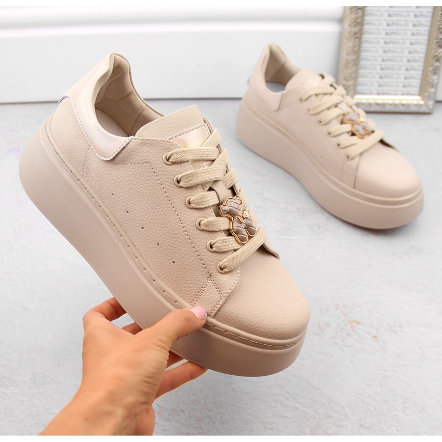 Részletek: Női bőr sportcipő platformon, mackóval, bézs Vinceza 66641