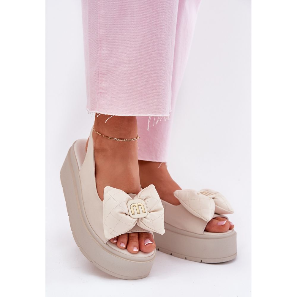 Az 5,5 cm magasságú hatalmas platform nem csak a viselkedés kényelmét biztosítja, hanem néhány centiméterre is hozzáad az ábrához, ami karcsúbbá teszi. A szandál elején lévő dekoratív íj finom akcentust vezet be, hangsúlyozva a női varázst. A beillesztésnek köszönhetően tiszta öröm.