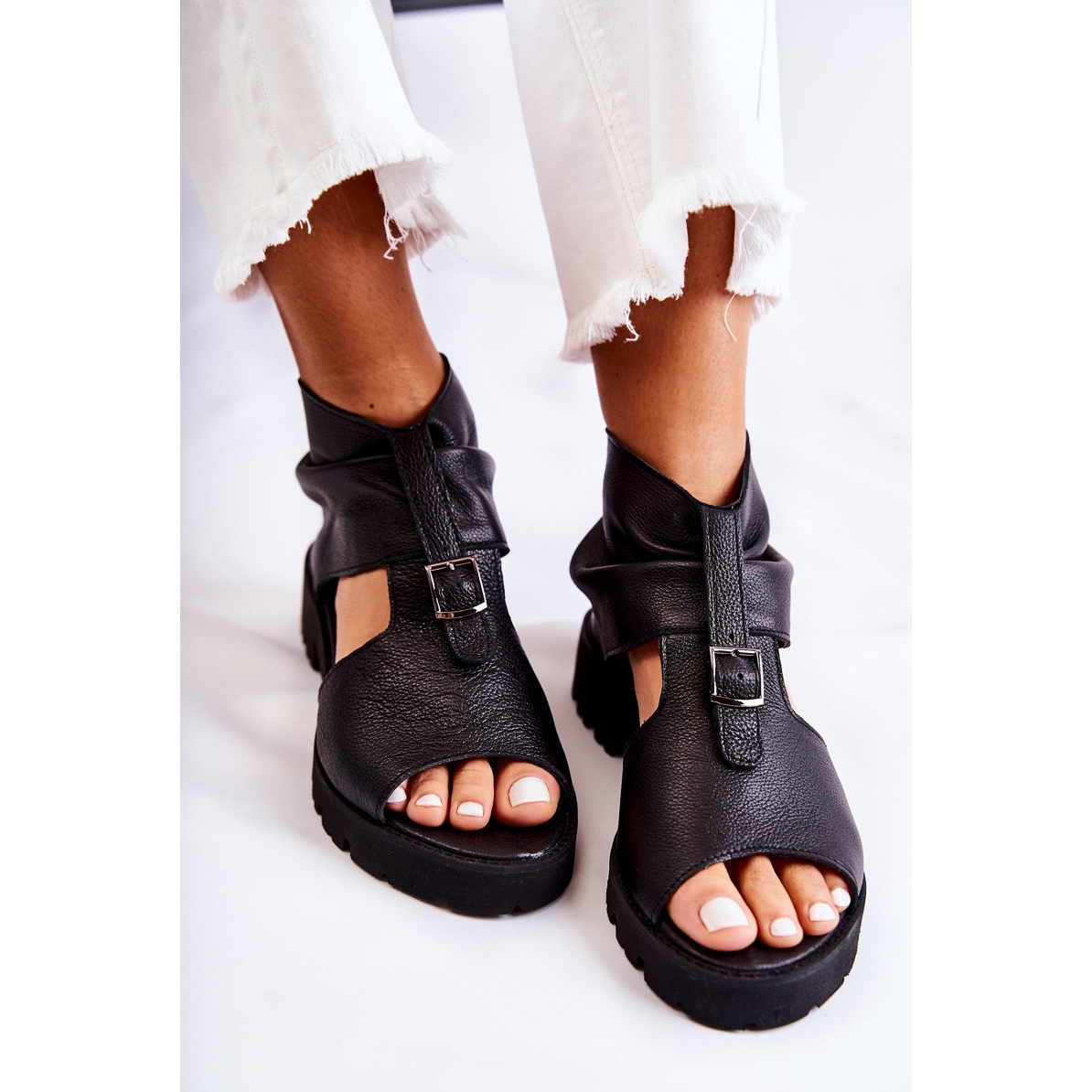 A szandál hátulja praktikus cipzárral van rögzítve, ami megkönnyíti a fel- és levételt. A szandálok oldalát elegáns kivágások díszítik, könnyedséget és modern karaktert adva. A nyitott, lekerekített orr biztosítja a viselési kényelmet, a lapos sarok pedig finom platformmal (2 cm) garantálja a maximális kényelmet egész nap.