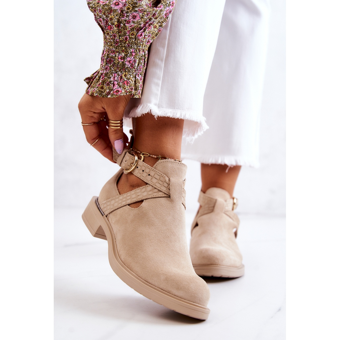 A csizmát divatos szabású szabása jellemzi, a felsőrész oldalain található fenomenális kivágások pedig könnyűvé és modernné teszik. A csattal rögzíthető állítható pánt tökéletes illeszkedést tesz lehetővé a lábfejhez, ami növeli a használat kényelmét. A lapos, 3,5 cm magas sarok biztosítja a stabilitást, ami ideális választássá teszi ezt a csizmát minden napra és különféle alkalmakra.