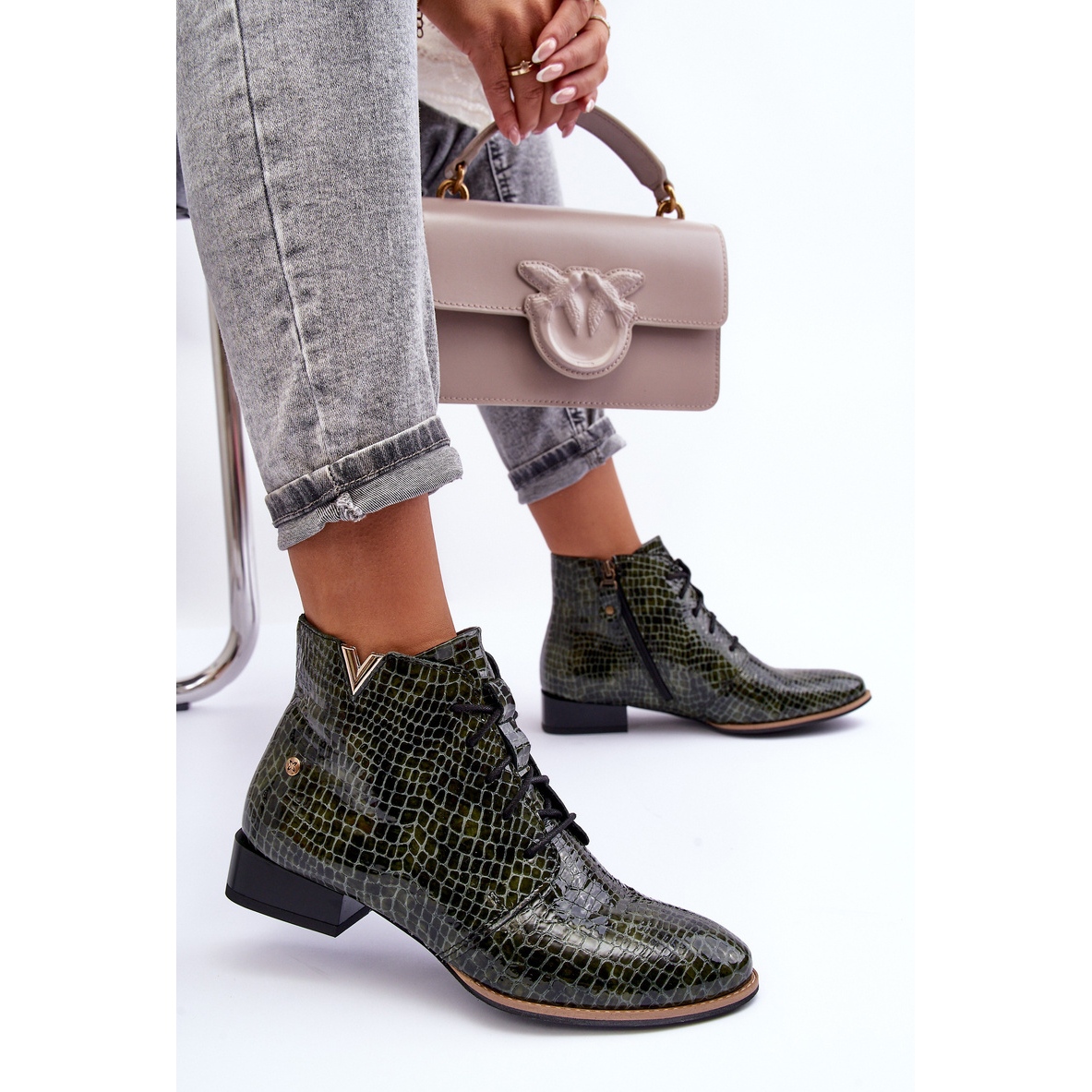 Női bőr maciejka 5743c-09 csizma-zöld, lakkozott, karakterrel. Egy elegáns vágás, amelyet a legmagasabb színvonalú lakkozott bőrből készítettek, kombinálva a klasszikusokat egy divatos, állati akcentussal. A modellt egy csúszkával rögzítve, a felső és emellett fűzve - stílus és kényelem egyben. Egy lapos, stabil sarok, 3 cm magasságú és mandula lábujja biztosítja a kényelmet a nap folyamán. A cipő eléri a bokát (felsõbb körülbelül 10 cm), és sok őszi és téli stilizációban nagyszerű (nincs szigetelés).