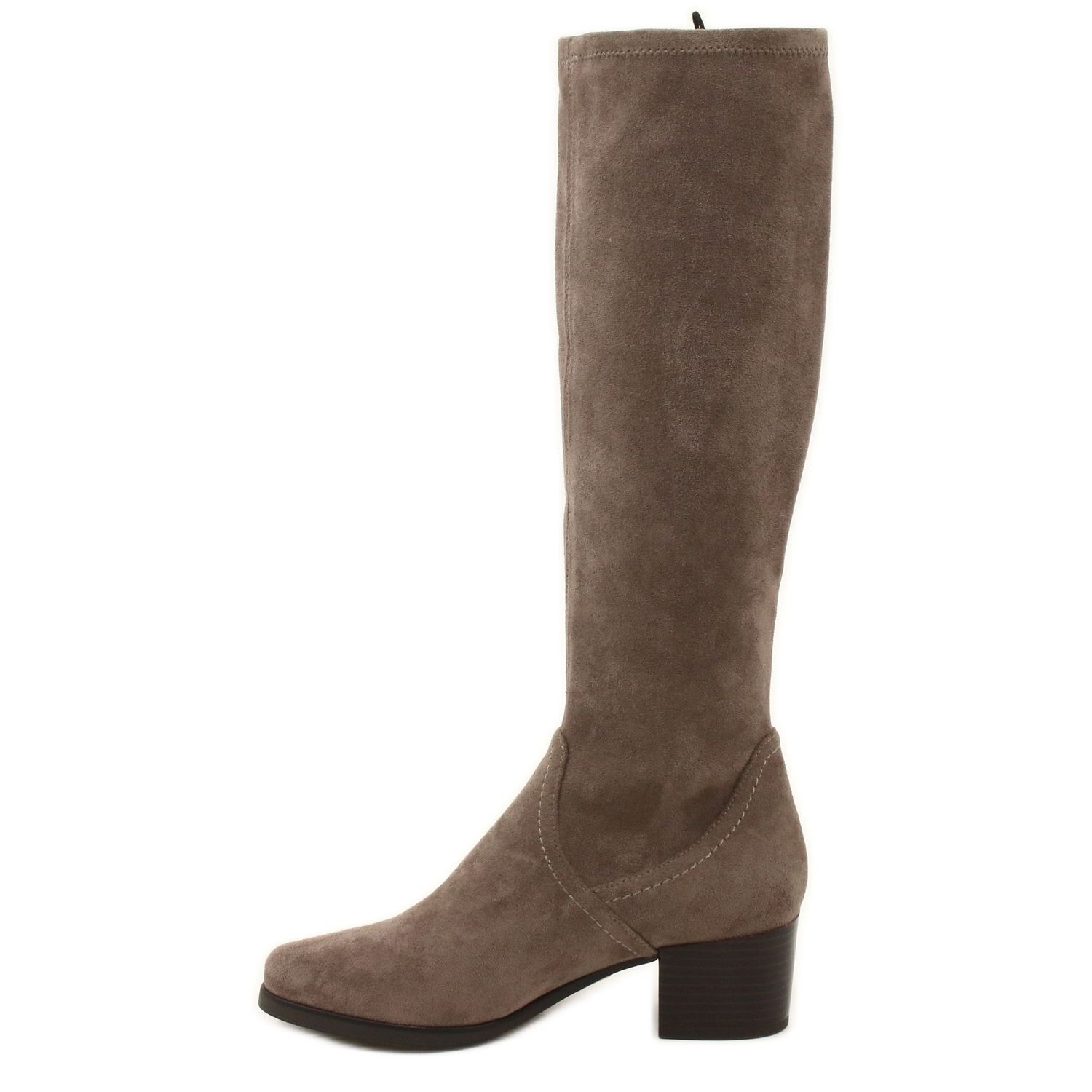 Elegáns, hosszú térdcsizmák, amelyek egyesítik a klasszikus vágást a vigasztalással. Vastagabb, textil velúr anyagból készült anyagból készült, amely szépen adaptálódik a borjúhoz, hangsúlyozva az ábrát. Tökéletes minden nap és elegánsabb stilizációkhoz.