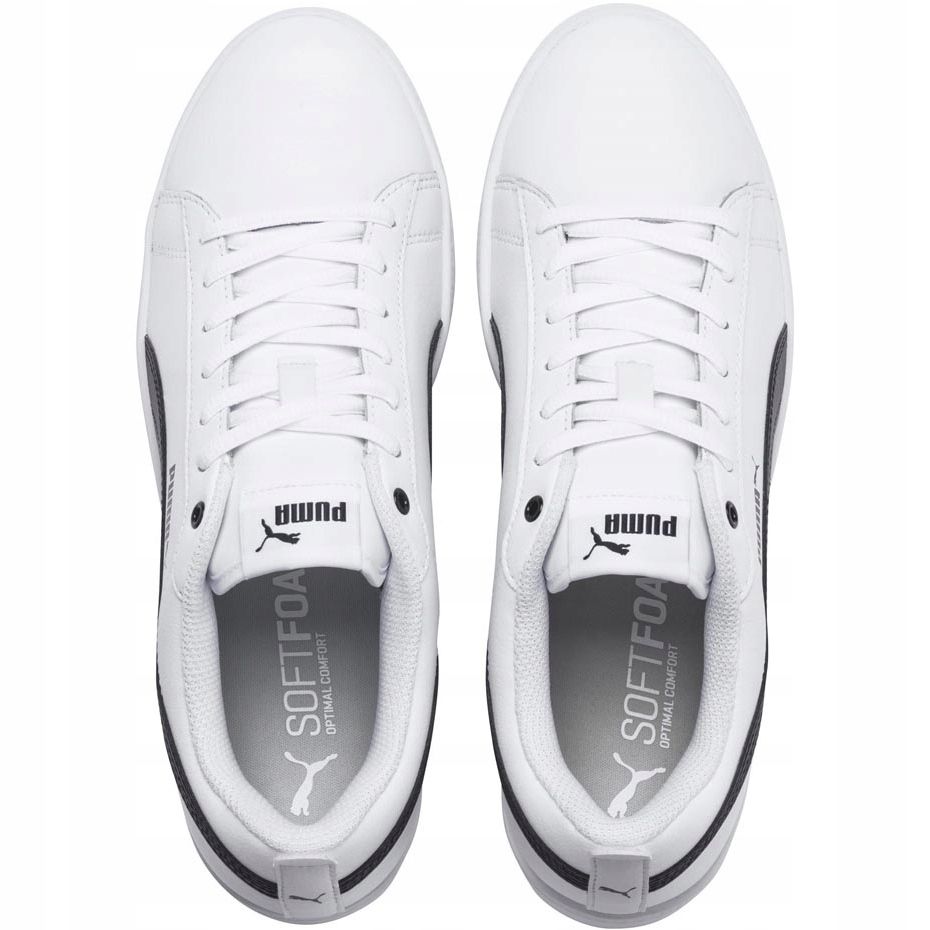 Női Puma Smash WNS V2 L - Stílusos, kényelmes és univerzális városi cipő, a fehérek klasszikus kombinációjában, fekete akcentussal (modell 365208 01). Tökéletes mindennapi használatra - munkához, sétához vagy egyetemen - egy sportos karaktert kombinálnak a városi megjelenéssel.