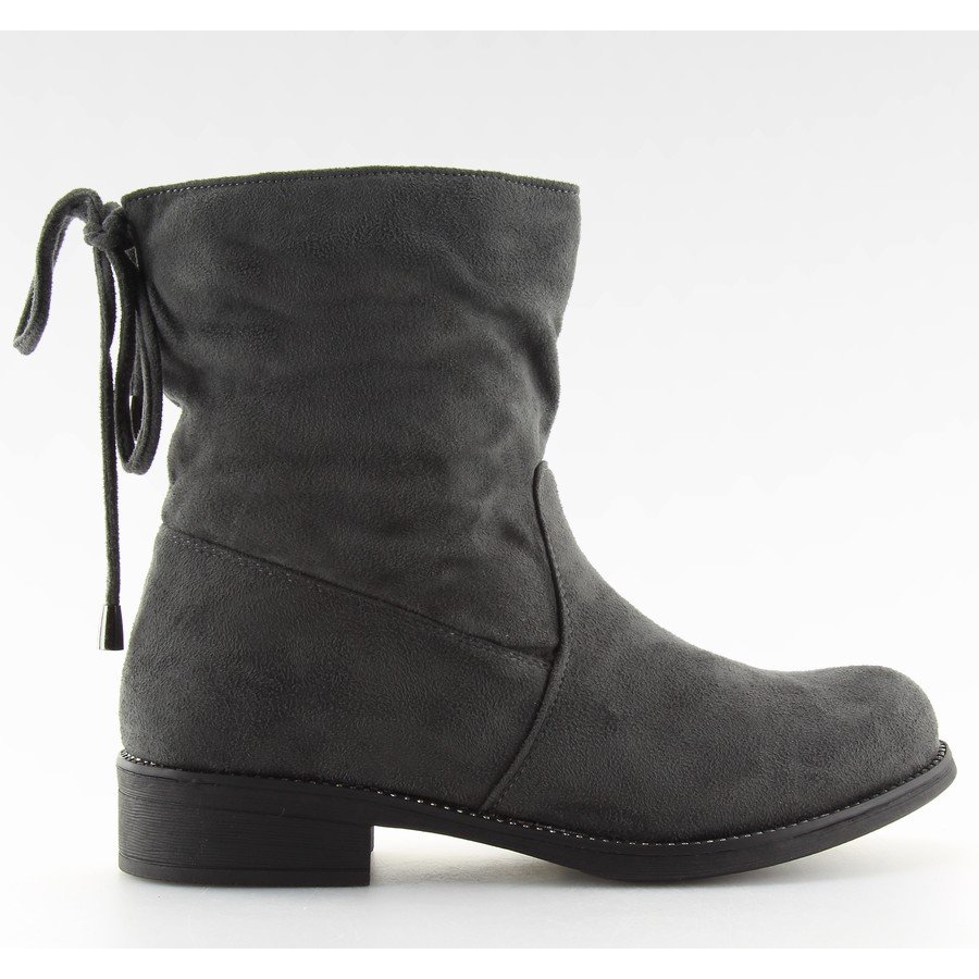 Szürke, lapos sarkú bokacsizma (kb. 3 cm), ökológiai velúrból. Felhívják magukra a figyelmet a finoman fodros felsőrészükkel, hátul dekoratív nyakkendővel, a fényes díszítéssel apró cirkóniákkal, valamint finom masnival és strasszokkal. A puha szőrmével bélelt belső melegséget és kényelmet biztosít. Az oldalsó cipzár megkönnyíti a gyors felhelyezést.