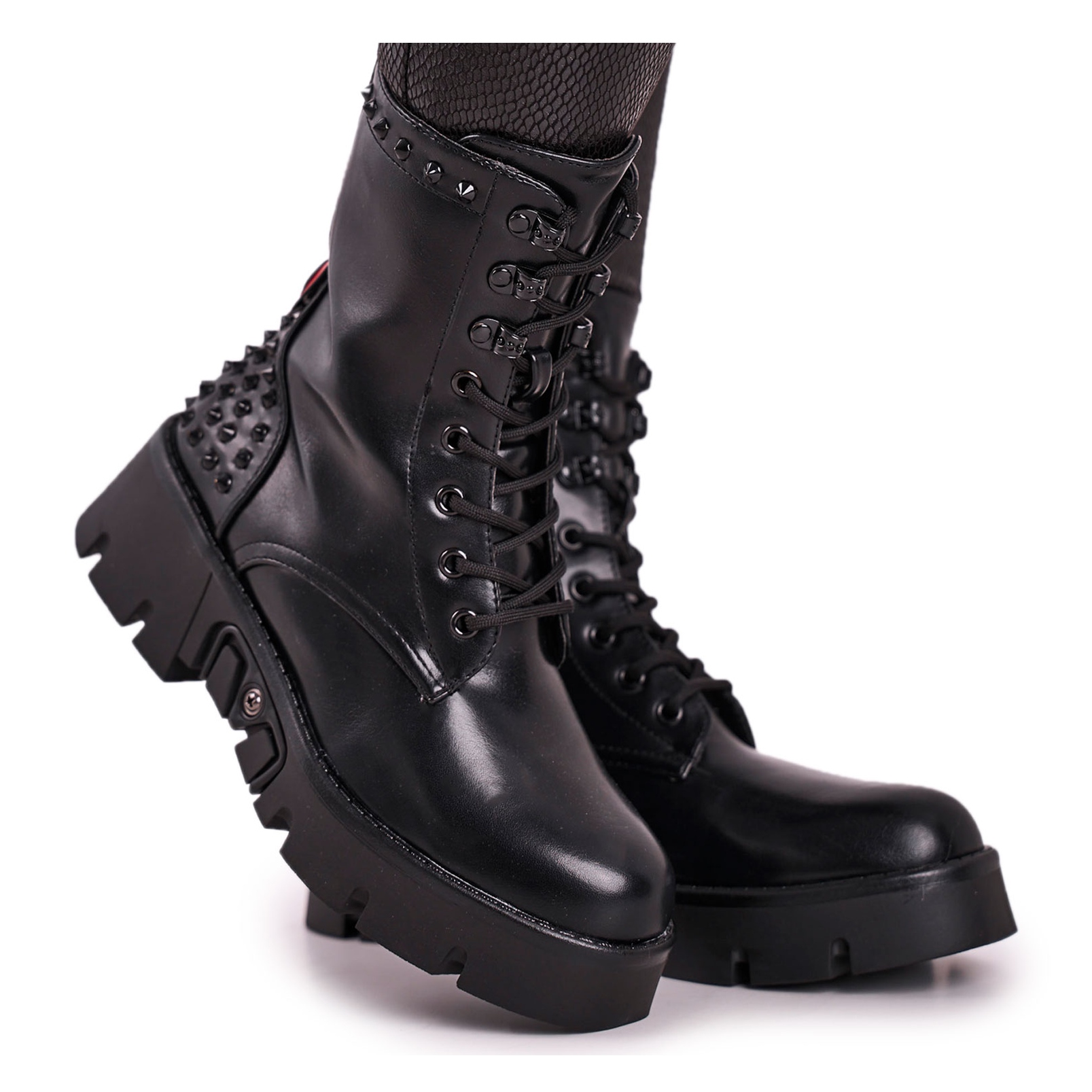 A Grunge stílusú FG2 platformon lévő női csizma ideális választás azoknak a nőknek, akik jellegzetes, erősebb akcentust szeretnének kölcsönözni stílusuknak. Ezeket a fekete csizmákat szilárd, magas platform és egyedi díszítés jellemzi, fekete strassz formájában. A klasszikus szabású, fűzős szabás, amelyet egy praktikus oldalsó cipzár egészít ki, nemcsak a divatos megjelenést, hanem a kényelmet és a könnyű felhelyezést is biztosítja.