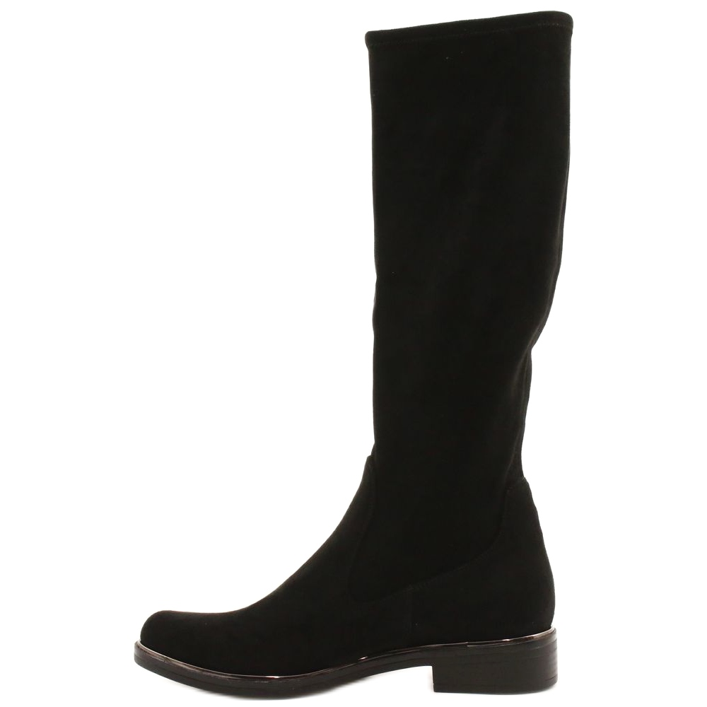Stílusos Caprice muskéták klasszikus fekete színben, húsos nyújtó velúr anyagból készültek. Az elasztikus felső felsők tökéletesen alkalmazkodnak a borjúhoz, és a belső szilikonszalag megakadályozza, hogy a cipő lecsúszjon - tökéletes a hosszabb kimenetekhez és a mindennapi stilizációkhoz. Modell szigetelés nélkül, egy sík sarkú sarokon, amelynek magassága 3,5 cm, kerek lábujjjal és a kapocs csúszásával.