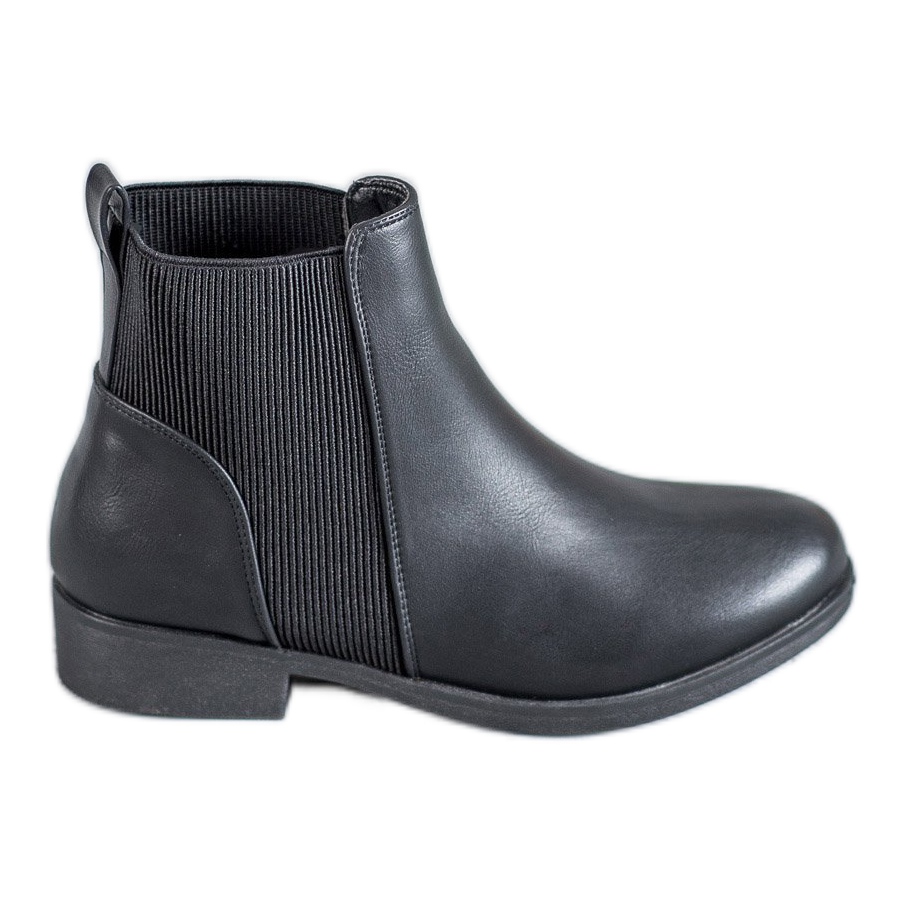 A csizmák sima bőrszerű anyagból készültek, amely modern megjelenést kölcsönöz, és könnyen karbantartható. Ezenkívül a boka körüli elasztikus betét biztonságosan tartja a lábfejet, a hátul lévő dekoratív hurok pedig finom bájt kölcsönöz.