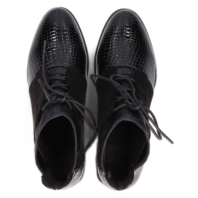 A többféle, különböző textúrájú bőr kombinációjának köszönhetően ezek a csizmák rendkívül modernek és stílusosak. Finom, lapos sarkuk és fűzős felsőrészük kényelmes viseletet garantál, a szemet gyönyörködtető részletek pedig karaktert adnak az egésznek.