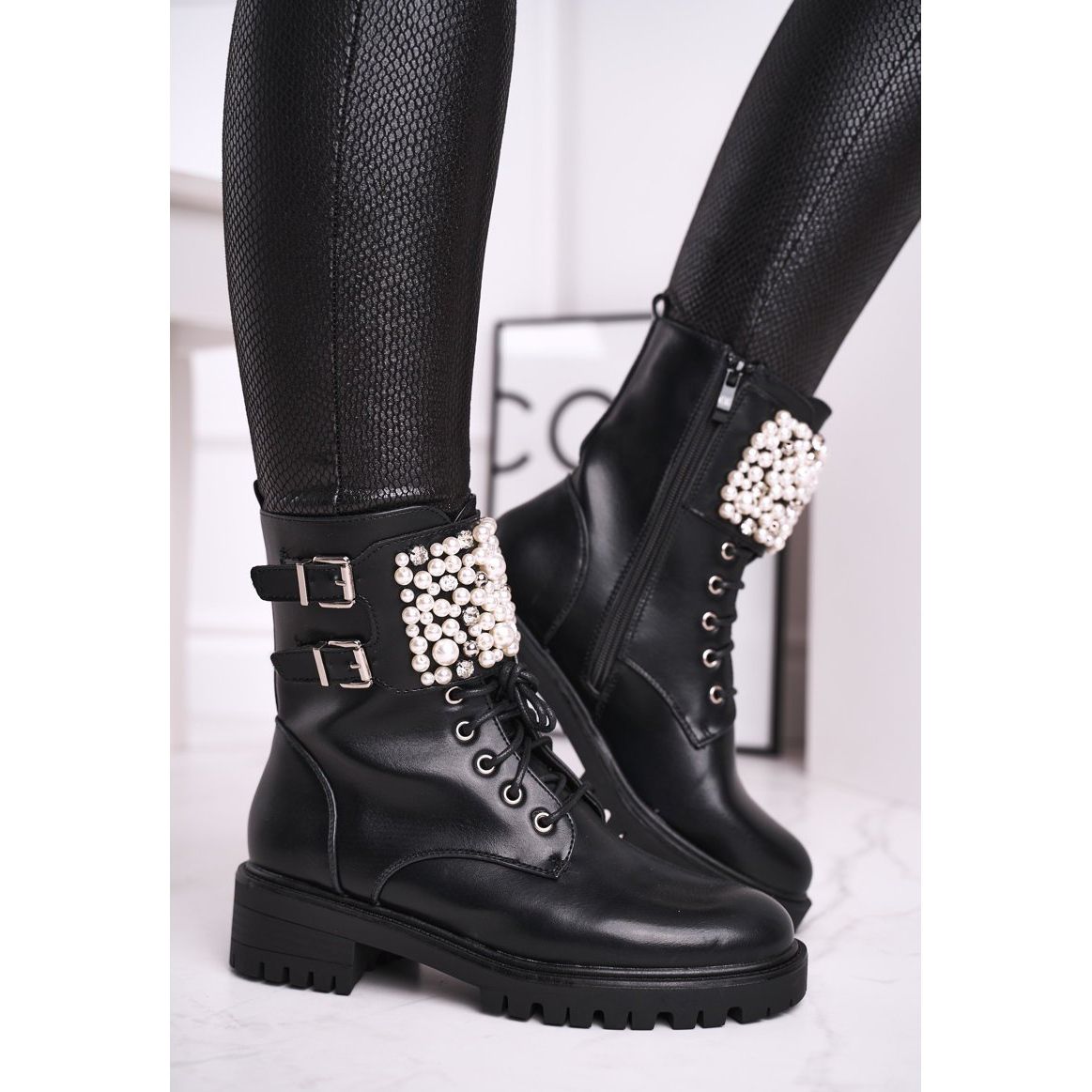 Az oldalrögzítésű bokacsizmákat egyedi díszítések gyöngyök és cirkóniák formájában különböztetik meg, amelyek vonzzák a tekintetet és karaktert kölcsönöznek nekik. A hajtóka alá rejtett fűzők nemcsak a beállítást segítik elő, hanem tetszetős dekorációt is alkotnak. A csizma belseje puha lábbelitakaróval van bélelve, amely biztosítja a kényelmet a mindennapi viselet során.