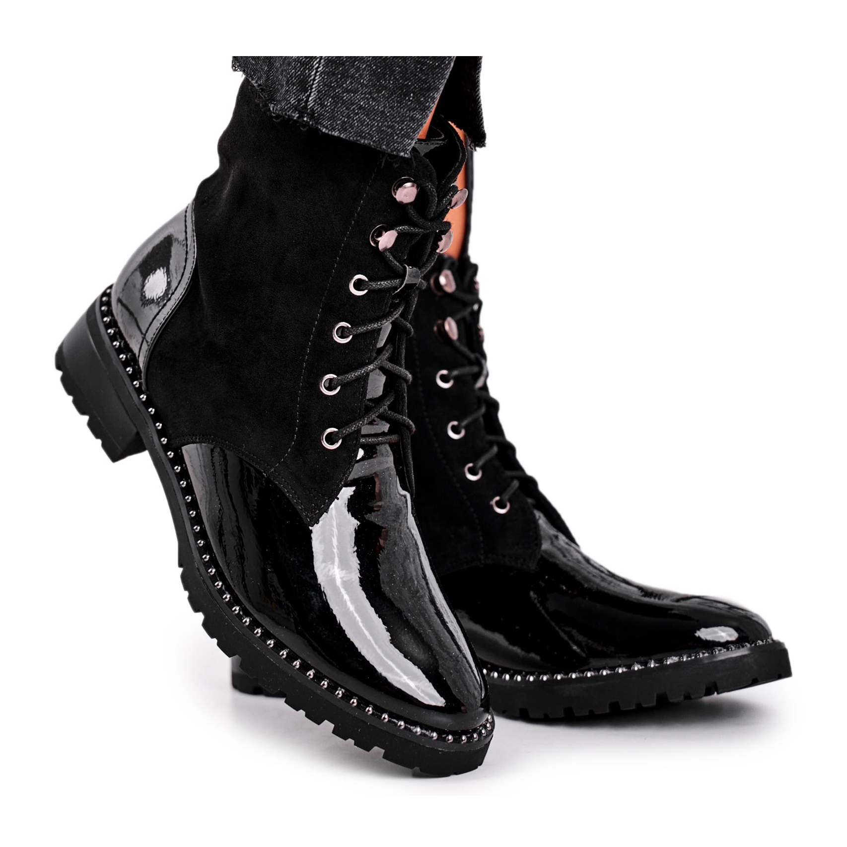 A csizma stílusa klasszikusan fűzős, a felsőrész oldalán található további cipzár megkönnyíti a fel- és levételt. A 14,5 cm-es felső magasság és a 4 cm-es lapos sarok nem csak a kényelmet, hanem a stabilitást is biztosítja járás közben. A csizmát strasszokkal és szegecsekkel díszítették, ami karaktert és egyedi stílust ad.