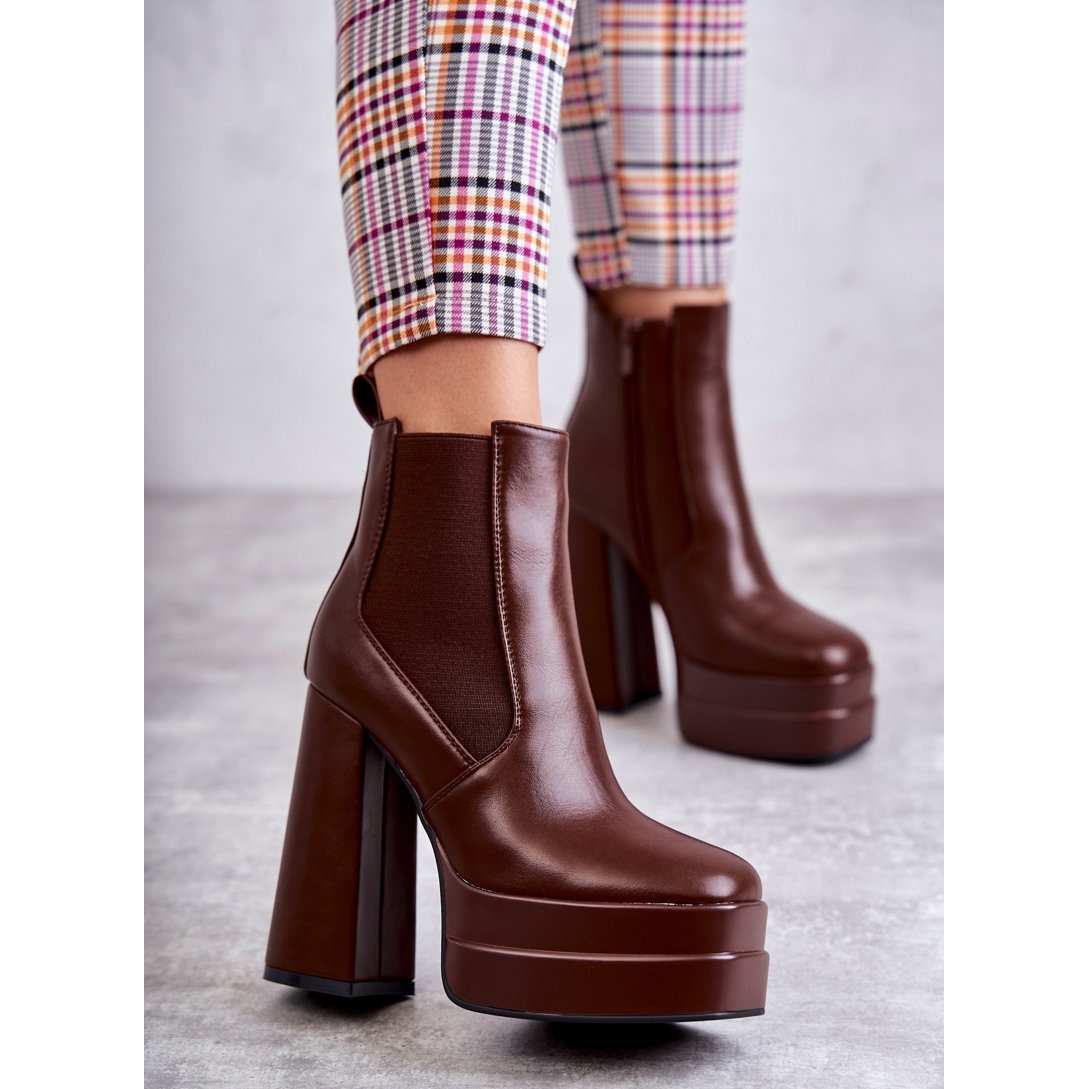 Ökológiai bőrből készült stílusos csizma divatos, meleg barna árnyalatú. Széles, stabil sarokra helyezve egy peronnal (sarok sarok 13 cm), egyesítik a megkülönböztetett megjelenést és a viselet kényelmét. A négyzet alakú orr, a merevített sarok és a gyakorlati zár megkönnyíti a felhelyezést. Az oldalak rugalmas beillesztése a lábhoz igazodik, és az öko-bőr betét kellemes érzést jelent a járáskor.