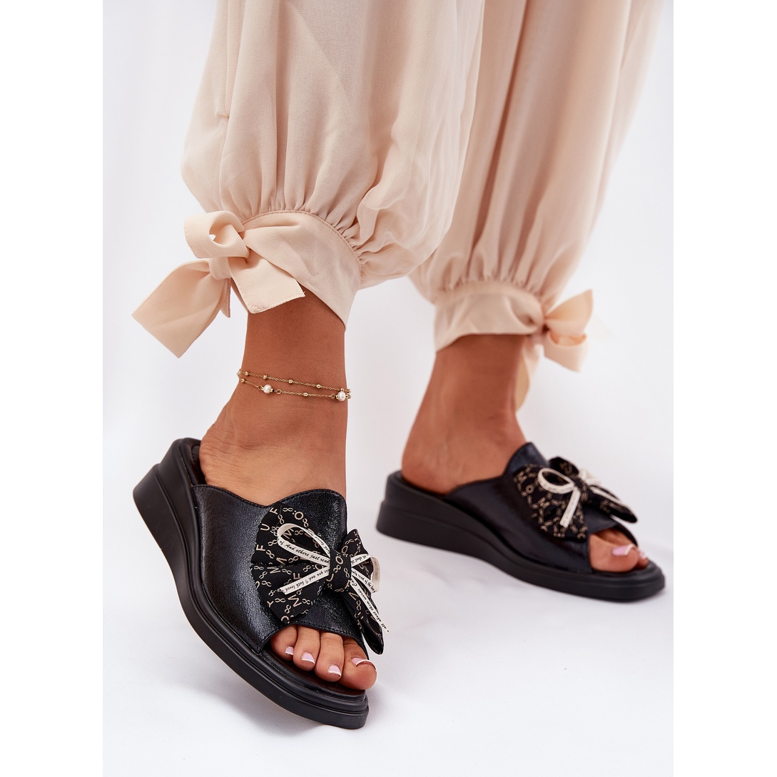 A stabil ékbe beágyazott modell, amelynek magassága 5 cm -es magasságban garantálja a kényelmet egész nap viselni, és az íjával a kialakítás finom varázst ad nekik, amely megragadja a szemét. A papucs klasszikus fekete színű, ami tökéletesen keveredik a különféle nyári ruhákba.